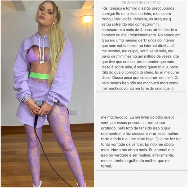 "Fãs, amigos e família que estão preocupados comigo: eu amo esse carinho, mas quero tranqulizar vocês. Relaxem, os ataques que estou sofrendo não começaram hoje, começaram a mais de 4 anos atrás, desde o começo do meu relacionamento. Na época em que eu era uma menina de 17 anos do interior que nem sabia mexer na internet direito. Já me revoltei, me culpei, sofri, senti ódio, me perdi de mim mesma um milhão de vezes, até que tive que crescer para entender que nada disso é sobre mim, é sobre quem fala. A boca fala do que o coração é cheio. Eu já me curei disso, desse peso que colocaram em mim. Ou pelo menos iss não me machuca mais como me machucava. Eu me livrei do ódio que já me machucava. Eu me livrei do ódio que já senti por pessoas e troquei por gratidão, pelo fato de ter sido isso o que realmente me fez crescer e virar essa mulher forte e foda que eu me sinto hoje. Que me fez ter tanta vontade de vencer. Eu não me abalo mais. Nada me abala mais. Eu entendi que isso na verdade é ser mulher, infelizmente, mas eu tenho orgulho da mulher que me tornei"