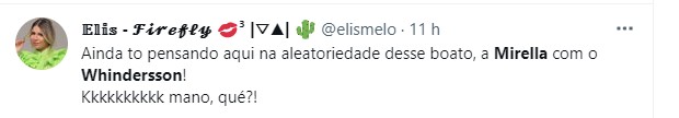Na web, muitos ficaram surpresos com as notícias e não se conformaram com o suposto novo casal. "Whindersson e Mirella pra mim é muito vibes Selena e Faustão: aleatório, perfeito pras fic da minha cabeça", brincou um. "Gente, que história é essa de Mirella e Whindersson? Esse quebra-cabeça está confuso e quem começou vai ter que desvendar", pediu outo. "Whindersson e MC Mirella, se tem casal mais improvável, acho que acabei de achar", comentou outro.