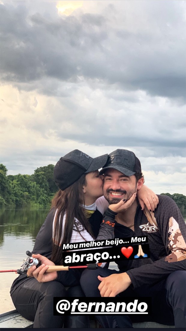 Maiara, da dupla com Maraisa, publicou vídeo e foto no Instagram para se declarar para o namorado, o sertanejo Fernando, da dupla com Sorocaba. Os dois assumiram o namoro recentemente e não param de trocar declarações apaixonadas nas redes sociais. "Meu melhor beijo, meu abraço. Meu melhor tudo", escreveu a cantora. Nas imagens, eles estão em um barco pescando no Mato Grosso do Sul.