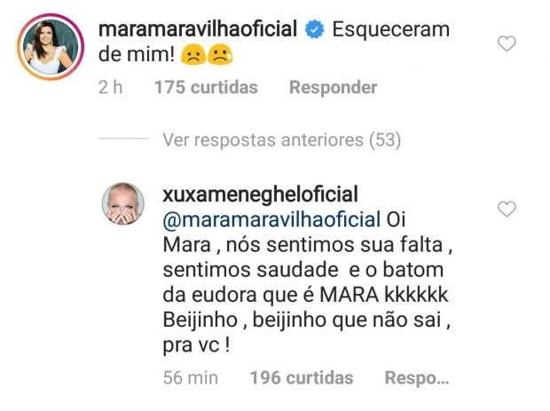 A dona do perfil também rebateu. “Oi Mara, nós sentimos sua falta, sentimos saudade e o batom da Eudora que é MARA! KKKKKK… Beijinho, beijinho que não sai pra você“, comentou Xuxa, citando o produto, num trocadilho com o nome da apresentadora, e o slogan da campanha.