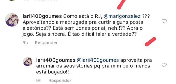 Modelo publicou prints de comentários de perfil falso no Instagram.