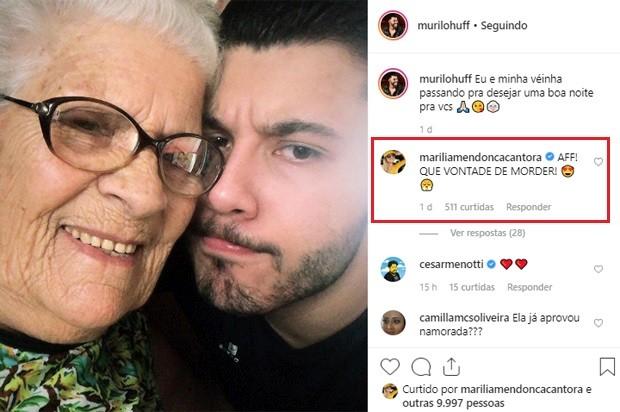 Murilo publicou um registro fofinho ao lado da avó e a artista ficou toda mexida com a imagem. "Eu e minha véinha passando pra desejar uma boa noite pra vocês", escreveu Huff na legenda. Marília não perdeu tempo e logo comentou: "Aff! Que vontade de morder". Fofos!Os dois são super discrestos quando se trata do namoro, e ainda não compareceram em nenhum envento oficial juntos. Os pombinhos se conheceram durante a gravação de uma música de autoria dele, há mais o menos um ano. Juntos, eles cantam no DVD do goiano a canção 'Dois Enganados'.