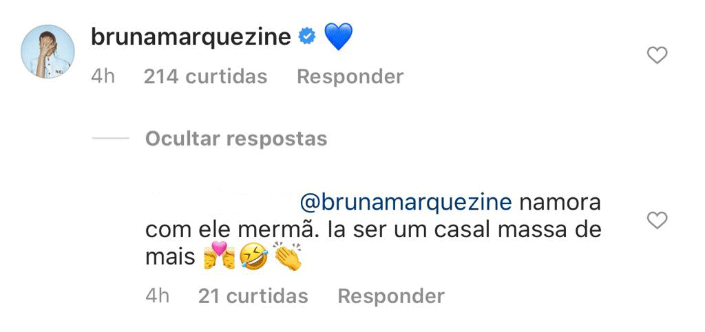 Bruna - que foi apontada como nova namorada de Enzo - deixou uma figurinha de coração nos comentários e os fãs logo começaram a shippar o casal. Entre muitos emojis de coração e curtidas, teve até briga entre o perfil Brumar - que shippa a atriz com seu ex, o jogador de futebol Neymar - e o pessoal do Bruenzo - que shippa a atriz e o filho de Claudia e Edson. "Assim como nós ficamos pedindo Bruenzo, vocês também ficam pedindo Brumar", apontou uma internauta que torce por Bruna e Enzo juntos. "Namora com ele, mermã. Ia ser um casal massa demais!", opinou outra seguidora.