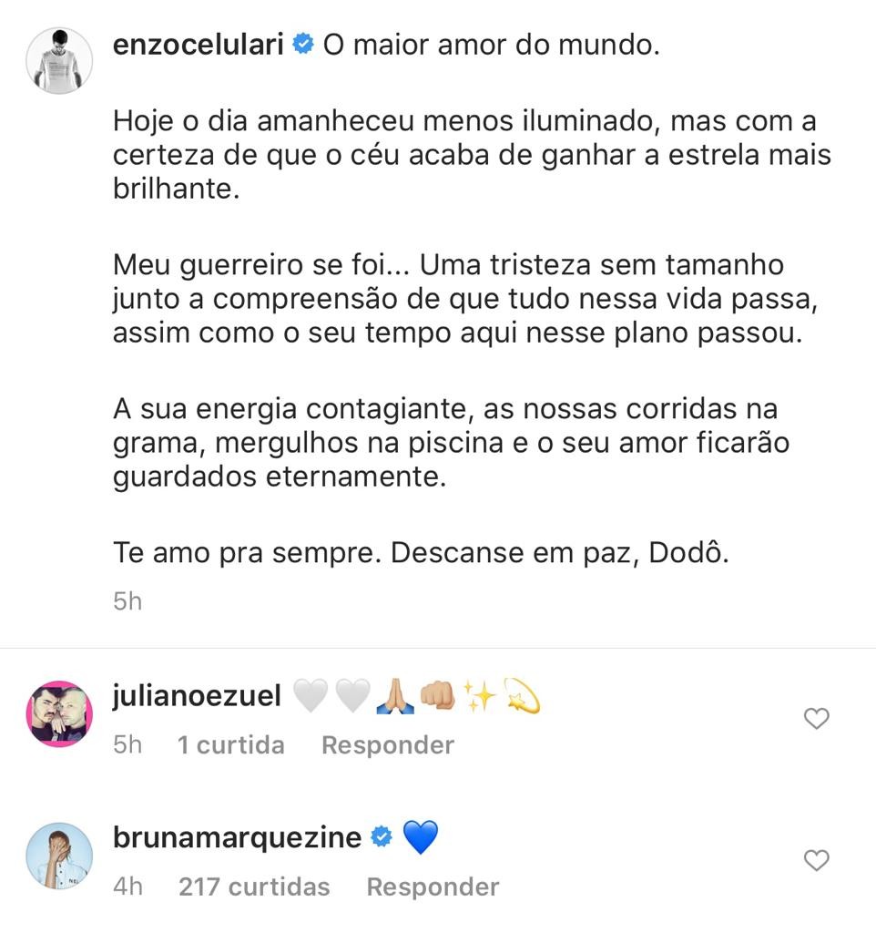 "O maior amor do mundo. Hoje o dia amanheceu menos iluminado, mas com a certeza de que o céu acaba de ganhar a estrela mais brilhante. Meu guerreiro se foi... Uma tristeza sem tamanho junto à compreensão de que tudo nessa vida passa, assim como o seu tempo aqui nesse plano passou. A sua energia contagiante, as nossas corridas na grama, mergulhos na piscina e o seu amor ficarão guardados eternamente. Te amo para sempre. Descanse em paz, Dodô", escreveu o rapaz.