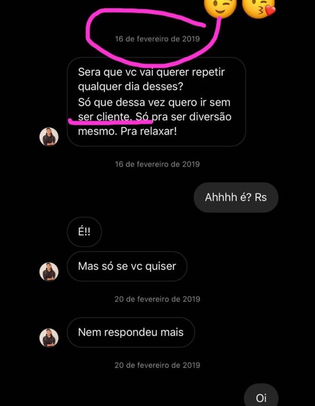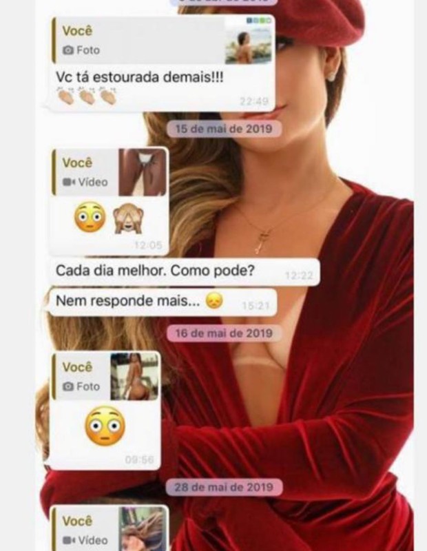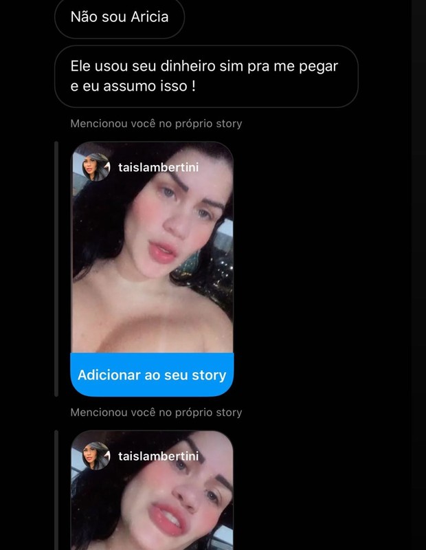 "Coloquei isso da Tais [Lambertini] porque ela autorizou, óbvio. Ela já até colocou na rede social dela. Eu tava reparando nesse caso... ela é uma pessoa que trabalha com isso. A pira dele era trair as pessoas, enganar, se sentir superior, manipular e passar a perna. Nem a prostituta ele queria pagar. Estava tentando convencer a prostituta a dar para ele de graça. Isso é um desvio de caráter muito grande. Sai com a prostituta, paga e depois quer comer de graça? Enganar tanto tempo assim, foi só a trouxa aqui. Não vai sair usando todas as pessoas assim, passando a perna no mundo inteiro. Uma hora a casa cai", diz.