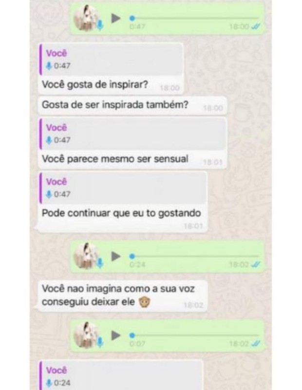 "Quando eu disse que eram 16 traições, eu não sabia nem um quinto. Já passou de 50. Não consigo nem mais quantificar. O mais triste de tudo é saber que estava grávida quando essa p*taria começou. Quando estava amamentando, poderia ter passado doenças à minha filha. Isso não foi pensado em nenhum momento. Isso me choca, é [falta de] caráter, isso é muito sério! A quantidade de parceiras que ele teve... isso é bizarro! Ele não pensou na filha dele. Já fiz testes de saúde, mas farei de novo e vou continuar fazendo", conta ela, antes de expor conversas do ex com prostitutas.