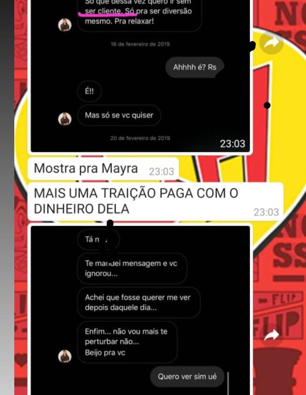 "Todos os dias chegam muitos prints, e-mails... eu ainda pagava os programas dele. Umas prostitutas bonitas, com certezas caras porque não têm cara de p*ta barata. Eu tava bancando caro. É muito triste tudo isso porque não tem a ver com traição física, tem a ver com traição moral. Com a maneira como a pessoa te destrata, te manipula e mente. Olha pra tua cara e fala que é fiel, que não te trai, que nunca te trairá, que morre e se mata se você terminar, o mundo acaba... e de repente você descobre que toda a sua fantasia, toda a sua história de amor, era uma mentira bizarra", detalha Mayra.