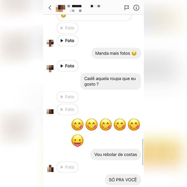 Na tela seguinte, é possível ver que a pessoa que está em bate-papo com Rebecca chegou a enviar fotos, e a funkeira pediu mais. "Cadê aquela roupa que eu gosto?" questionou, e seguiu na provocação: "Vou rebolar de costas".