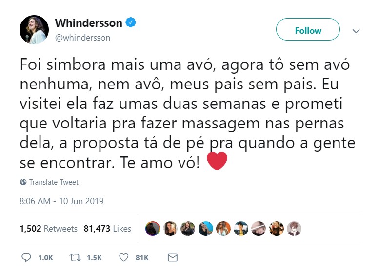 “Foi simbora mais uma avó, agora tô sem vó nenhuma, nem avô, meus pais sem pais. Eu visitei ela faz umas duas semanas e prometi que voltaria pra fazer massagem nas pernas dela. A proposta tá de pé pra quando a gente se encontrar. Te amo, vó”, escreveu Whindersson.