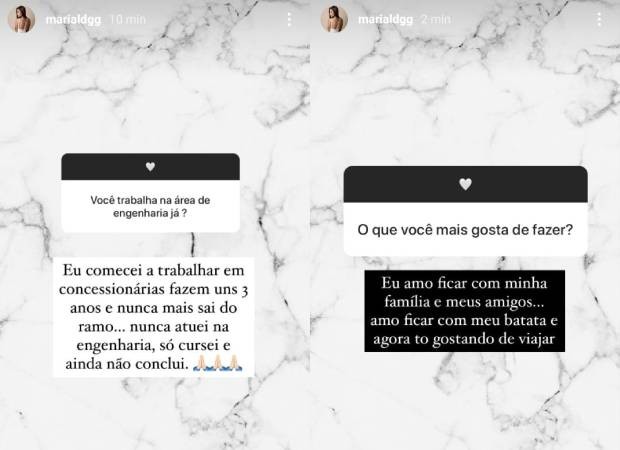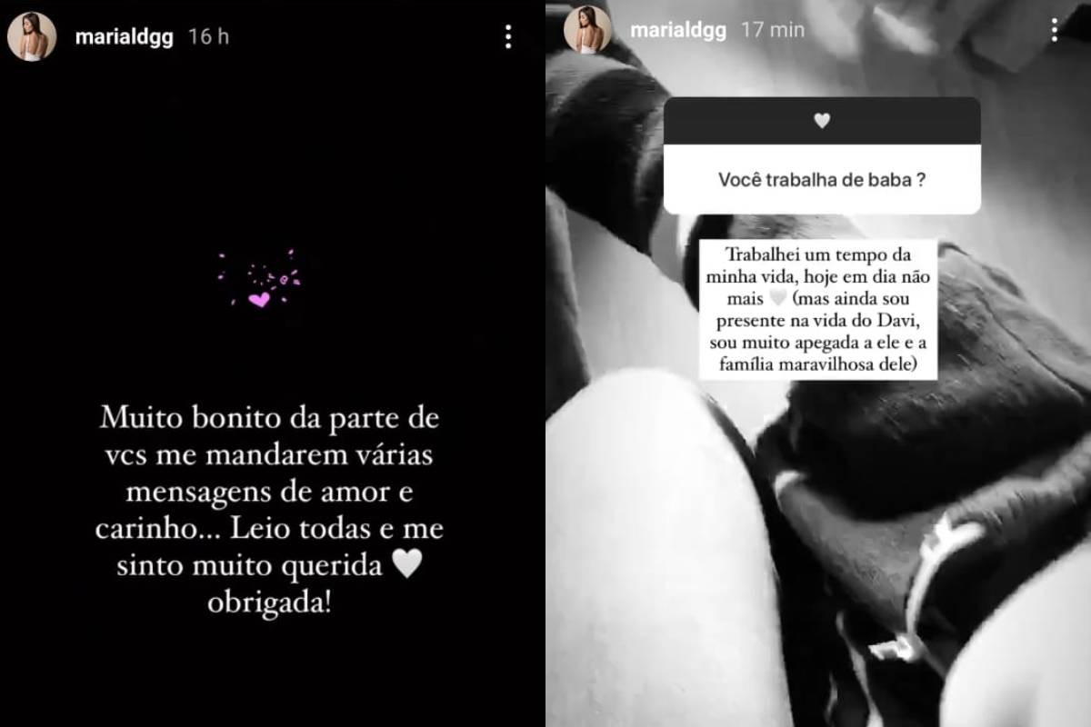 Depois, ao respondeu uma pergunta de uma pessoas, Maria revelou que já trabalhou como babá. "Trabalhei por um tempo da minha vida, hoje em dia não sou mais. Mas ainda sou presente na vida do Davi, sou muito apegada a ele e à família maravilhosa dele", disse.