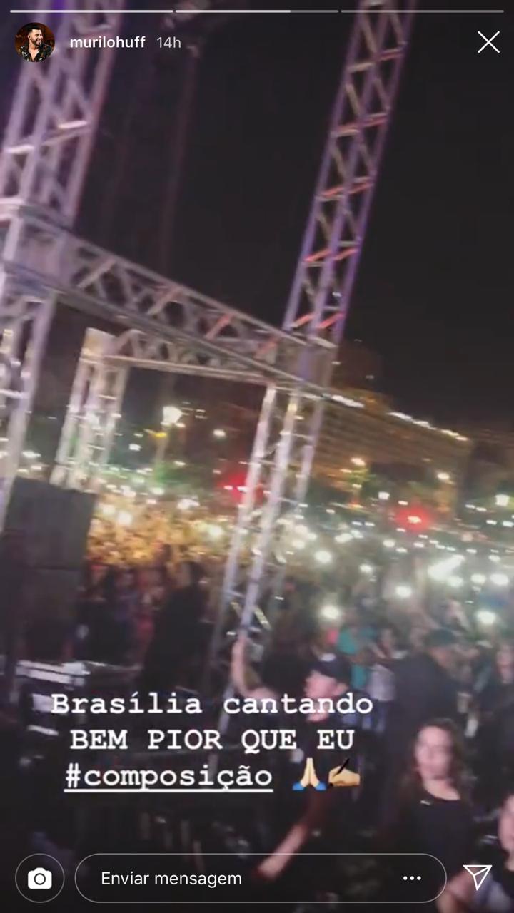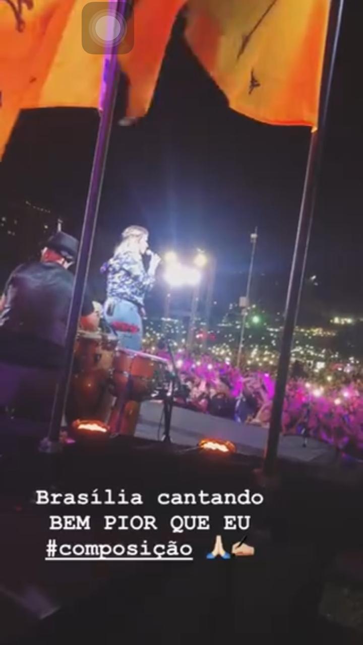 Marília Mendonça se apresentou, na noite da última quarta-feira (29), em Brasília. A cantora levou o projeto Todos os Cantos para para multidão que a esperava. Quem acompanhou o show dos bastidores foi seu namorado, Murilo Huff. O músico publicou um vídeo em seu Instagram, mostrando o público animado entoando o hit Bem Pior Que Eu, composto por ele. As informações são da Revista Quem.