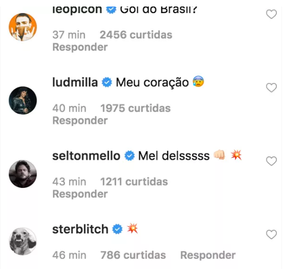 Nos comentários, todo mundo pirou, inclusive alguns amigos famosos do jogador, como Ludmilla, Leo Picon e Selton Mello.