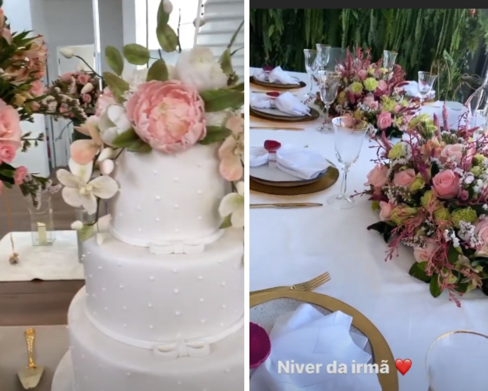 Simone também está participando da comemoração e mostrou os mesmos preparativos que Simaria, incluindo um bolo de três andares e uma mesa cheia de doces e flores.