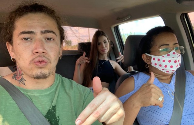 Quem também aproveitou para compartilhar uma foto em família foi a mãe de Whindersson. O trio aparece dentro de carro ao lado posando com o gesto do "trava na beleza".