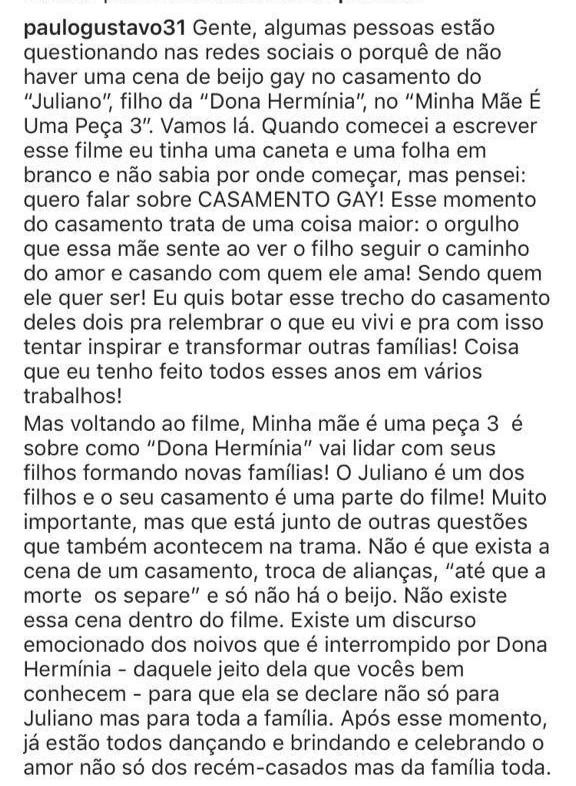 "Mas voltando ao filme, Minha mãe é uma peça 3 é sobre como “Dona Hermínia” vai lidar com seus filhos formando novas famílias! O Juliano é um dos filhos e o seu casamento é uma parte do filme! Muito importante, mas que está junto de outras questões que também acontecem na trama. Não é que exista a cena de um casamento, troca de alianças, “até que a morte os separe” e só não há o beijo. Não existe essa cena dentro do filme. Existe um discurso emocionado dos noivos que é interrompido por Dona Hermínia - daquele jeito dela que vocês bem conhecem - para que ela se declare não só para Juliano mas para toda a família. Após esse momento, já estão todos dançando e brindando e celebrando o amor não só dos recém-casados mas da família toda", disse o ator.