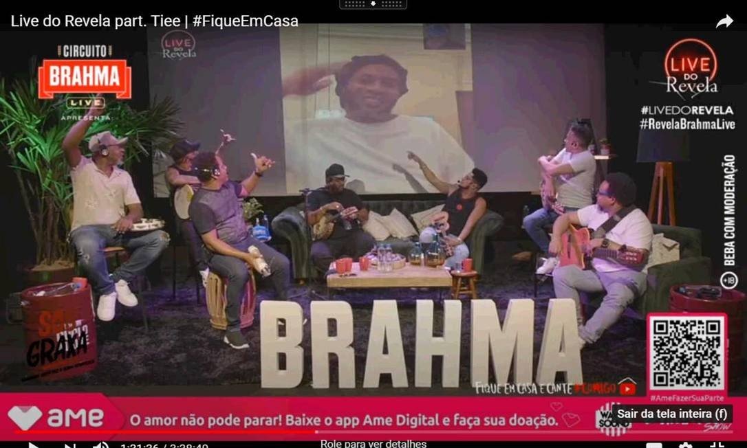 Com uma hora e meia de show, Ronaldinho apareceu no telão ao fundo da apresentação do Grupo Revelação. E foi saudado pelos músicos. "Olha o R10 aí. Esse é nome parceiro, esse é o cara. Esse driblou até o coronavírus. Tamo junto!", exaltou o vocalista.
