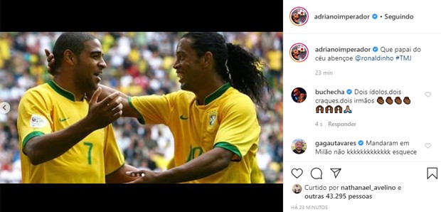 "Parabéns Xará! Que você vença essa etapa difícil da sua vida com a mesma alegria de sempre! #Ronaldinho40 @ronaldinho", postou Ronaldo. "Que papai do céu abençoe @ronaldinho", publicou Adriano.