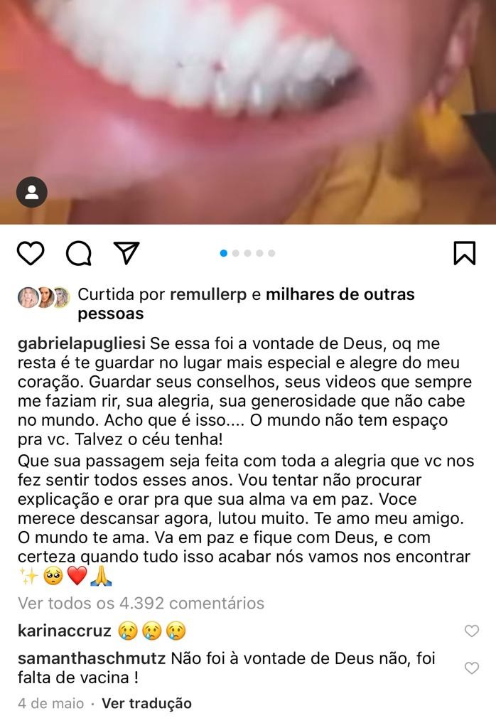 "Se essa foi a vontade de Deus, o que me resta é te guardar no lugar mais especial e alegre do meu coração. Guardar seus conselhos, seus videos que sempre me faziam rir, sua alegria, sua generosidade que não cabe no mundo. Acho que é isso.... O mundo não tem espaço para você. Talvez o céu tenha! Que sua passagem seja feita com toda a alegria que você nos fez sentir todos esses anos. Vou tentar não procurar explicação e orar para que sua alma vá em paz. Você merece descansar agora, lutou muito. Te amo, meu amigo. O mundo te ama. Vá em paz e fique com Deus e, com certeza, quando tudo isso acabar nós vamos nos encontrar", escreveu Gabriela.