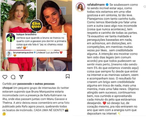 Em um comentário na primeira publicação, Rafa garantiu que não existe nenhum clima ruim entre ela e a atriz. "Se soubessem como está sendo incrível estar aqui, como todas nós estamos em uma vibe gostosa e em sintonia, está tão leve. Planejamos com tanto carinho tudo. Como temos liberdade pra falar uma com a outra caso algo nos incomode (coisa que nunca aconteceu), tem respeito e carinho de todas as partes. Tá exaustivo ver tanta maldade e perseguições baseadas em nada, em achismos, em distorções, em competições, em mentiras muitas vezes por likes.. sem credibilidade alguma", declarou ela.