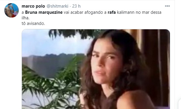 "Certeza que quando a Bruna se tranca no quarto para dormir, a primeira coisa que ela fala é 'por que chamou essa Rafa?'", diz um dos posts. "A Bruna Marquezine vai acabar afogando a Rafa Kalimann no mar dessa ilha. Tô avisando", afirma outro. "Imagina a Bruna Marquezine que achou que ia ter paz lá na ilha e vem a Rafa Kalimann gravando Stories 24 horas do lado da menina... eu jogava o celular dela no mar.", escreveu mais uma pessoa.