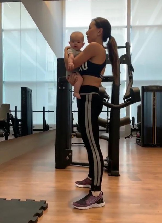 A apresentadora postou sem seu Instagram Stories, na noite de segunda-feira (20), vídeos na qual aparece se exercitando com a filhota no colo, usando a bebê como peso durante o agachamento.