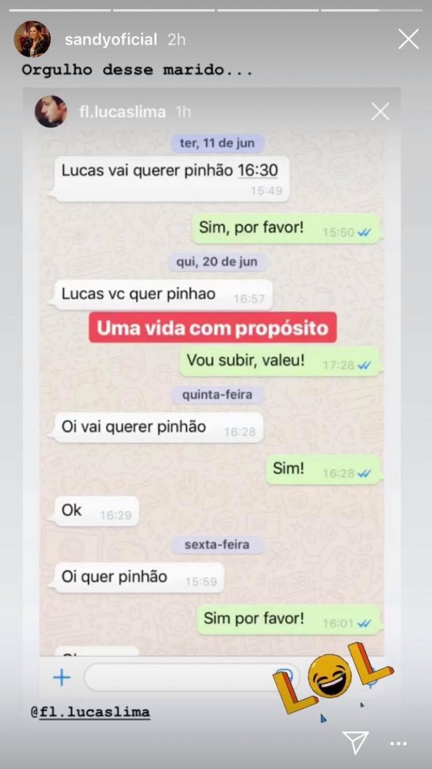 Sandy decidiu expôr a intimidade com o marido, Lucas Lima, ao compartilhar um Stories dele mostrando as suas conversas com a cantora no WhatsApp.