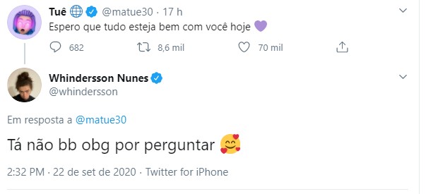 "Espero que tudo esteja bem com você hoje", escreveu a pessoa. "Está não, bebê. Obrigado por perguntar", respondeu Whindersson, que luta contra a depressão há alguns anos.
