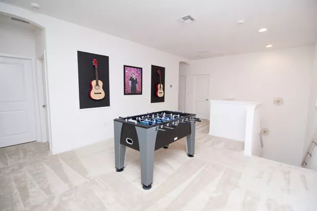 Quando crescer um pouco, João Pedro vai poder aproveitar com o irmão a sala de jogos que, inspirada no tema "Música", tem violões autografados por Matheus na parede para decorar o ambiente, além de mesa de pebolim. "São alguns violões que costumo usar para fazer músicas. Mesmo lá estou trabalhando", explica o goiano.