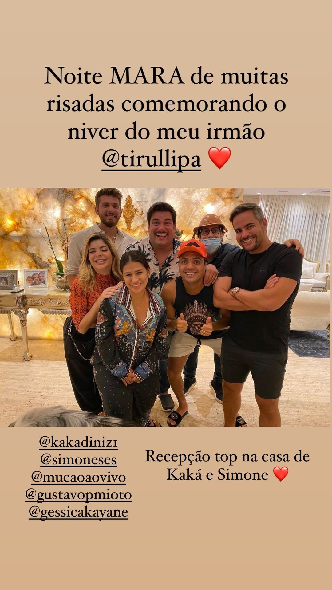 "Deus nos presenteia com amigos que viram irmãos na nossa vida e esses aí são parte de mim. Obrigado, meu Deus, por tudo... Que noite maravilhosa. Obrigado, amigos e irmãos do peito @kakadiniz1 e @simoneses pela surpresa na casa de vocês no meu niver", começou Tirullipa.