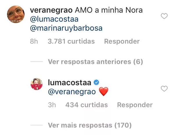 No olho de um furacão de polêmicas, Marina Ruy Barbosa recebeu apoio de sua sogra, Vera Negrão, nesta quarta-feira (20). A mãe de Xandinho Negrão, marido da atriz, comentou uma foto de Marina postada pela atriz Luma Costa, demonstrando seu carinho pela ruiva. "AMO a minha nora", escreveu.