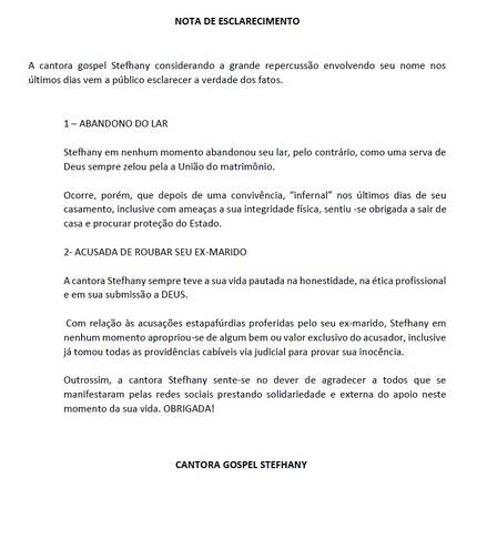 "Com relação às acusações estapafúrdias proferidas pelo seu ex-marido, Stefhany em nenhum momento apropriou-se de algum bem ou valor exclusivo do acusador, inclusive já tomou todas as providências cabíveis via judicial para provar sua inocência", diz um comunicado enviado pela equipe da cantora.