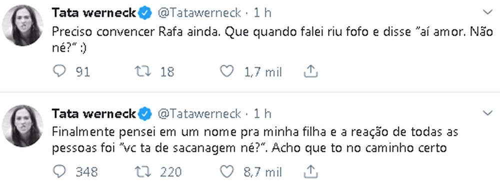 "Finalmente pensei em um nome pra minha filha e a reação de todas as pessoas foi 'Você tá de sacanagem né?'. Acho que tô no caminho certo", revelou. Depois disso, os fãs de Tatá entraram na brincadeira. Além de pedir dicas e dar conselhos, eles "apostaram" que nome deve ser esse.