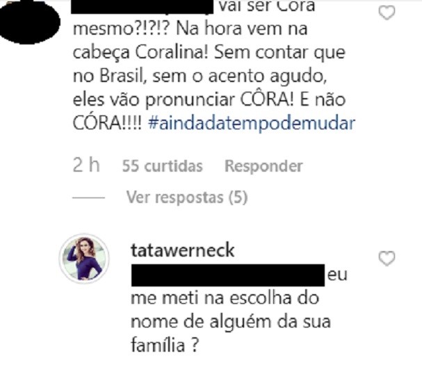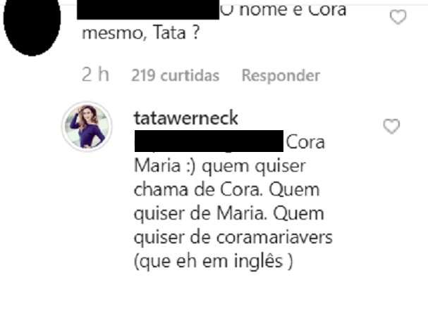 Alguns seguidores, entretanto, questionaram a escolha do nome Cora. "Vai ser Cora mesmo? Na hora, vem na cabeça Coralina. Sem contar que, no Brasil, sem o acento agudo, vão pronunciar Côra! E não Córa! #Aindadátempodemudar", disse um homem. "Eu me meti na escolha do nome de alguém da sua família?", rebateu Tatá.