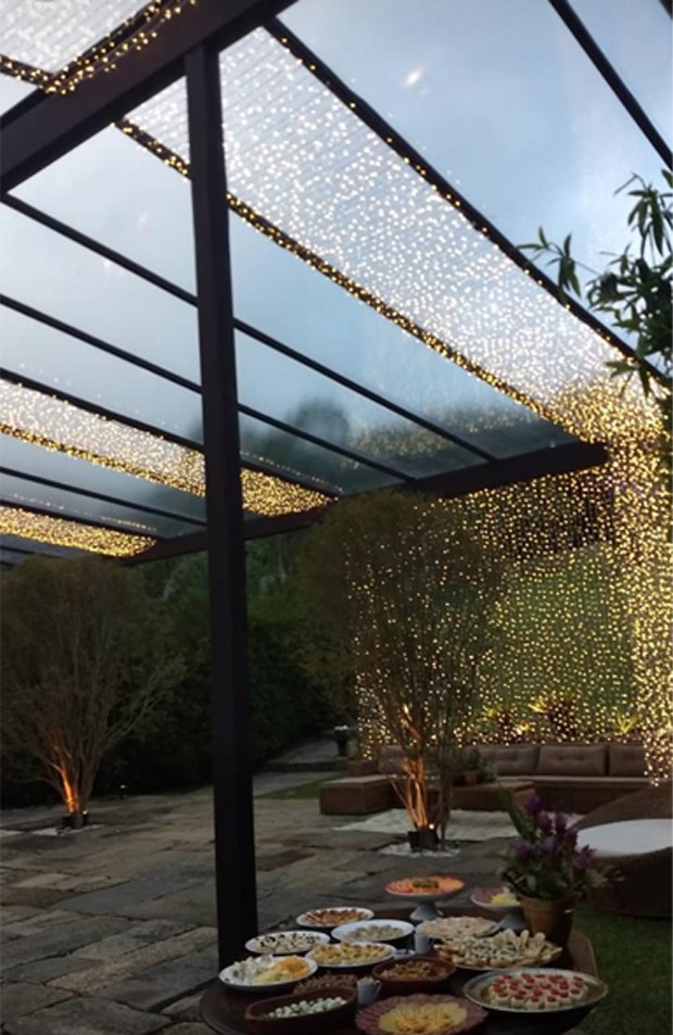 Com um tema próximo ao rústico floral, a mesa do bolo recebeu uma decoração com muitas flores e plantas. Ramos de flores com cores vivas enfeitaram o salão da festa. Com sabor de limão siciliano com frutas vermelhas, o bolo também ganhou uma decoração pra lá de linda. Os tradicionais bem-casados eram recheados de creme moça e leite ninho. Já no espaço externo, uma cortina luzes decorou uma espécie de tenda que cobria a parte de fora.