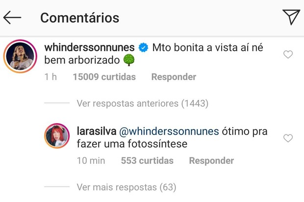 "Muito bonita a vista aí, né? Bem arborizado", escreveu ele. "Ótimo para fazer uma fotossíntese", respondeu ela.