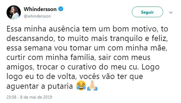 "Essa minha ausência tem um bom motivo, to descansando, to muito mais tranquilo e feliz, essa semana vou tomar um com minha mãe, curtir com minha família, sair com meus amigos, trocar o curativo do meu c*. Logo logo eu to de volta, vocês vão ter que aguentar a p******", escreveu ele, bem-humorado.