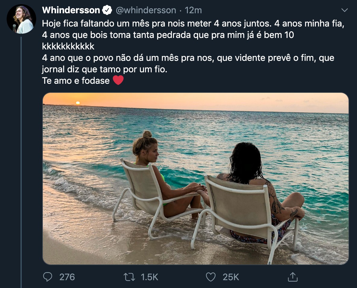 Whindersson Nunes se declarou para Luísa Sonza após rumores de crise no casamento. O humorista fez post no Twitter na noite desta terça-feira (28) e celebrou os quase quatro anos junto com a cantora. As informações são Revista Glamour.