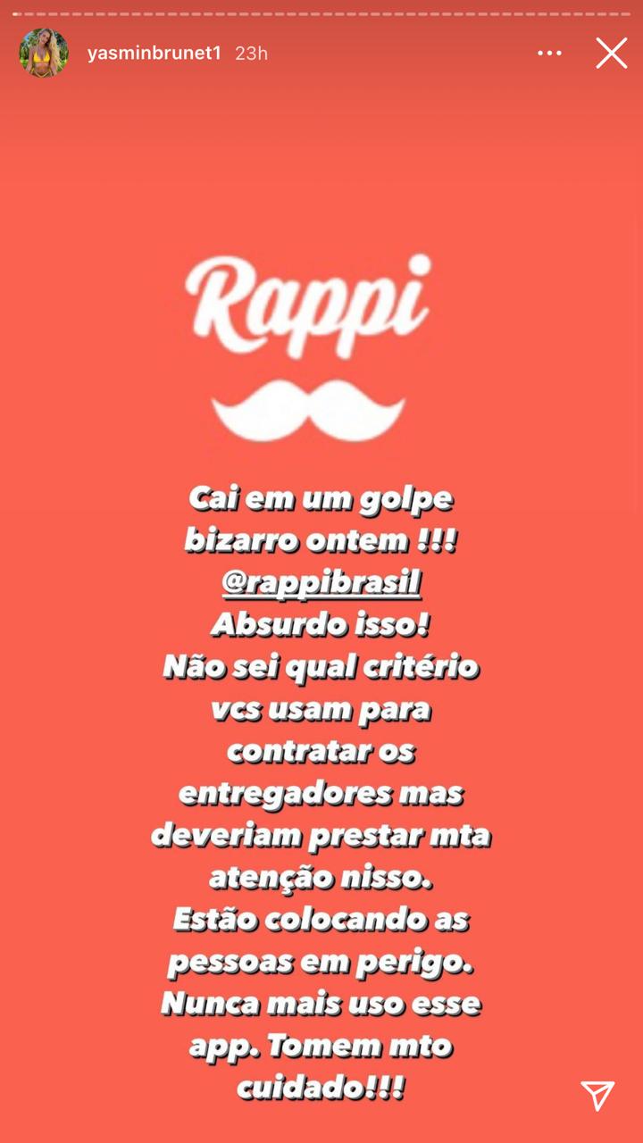Yasmin Brunet contou em seu Instagram que sofreu um golpe ao pedir comida em um aplicativo de entrega de comida, no Rio de Janeiro. Segundo a modelo, ela fez um pedido e o motoboy acabou passando R$ 7,9 mil em uma máquina diferente, mostrando outro valor.