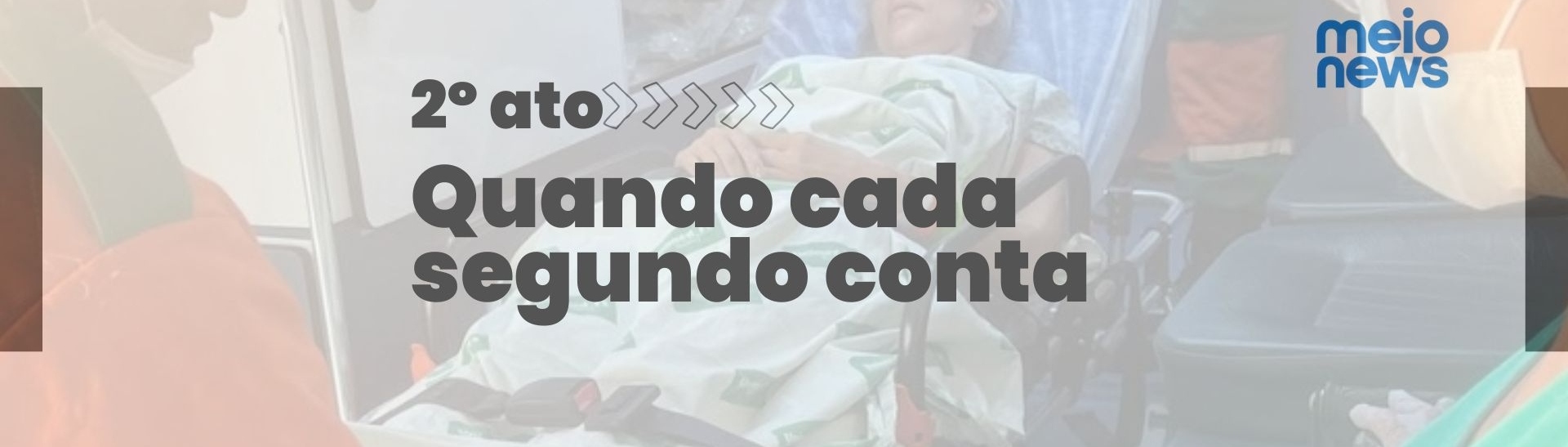 #PARATODOSVEREM A imagem mostra uma mulher deitada em uma maca hospitalar, coberta por um lençol claro e usando touca cirúrgica. Ela está sendo transportada por profissionais de saúde dentro de uma ambulância. Um dos socorristas, vestindo uniforme e máscara, está ao lado da paciente, atento ao atendimento. Sobre a cena, em destaque, há um texto em letras grandes e escuras que diz: “2º ato >>>> Quando cada segundo conta”. No canto direito superior, aparece o logotipo do “meio news” em letras azuis. FIM DA DESCRIÇÃO.