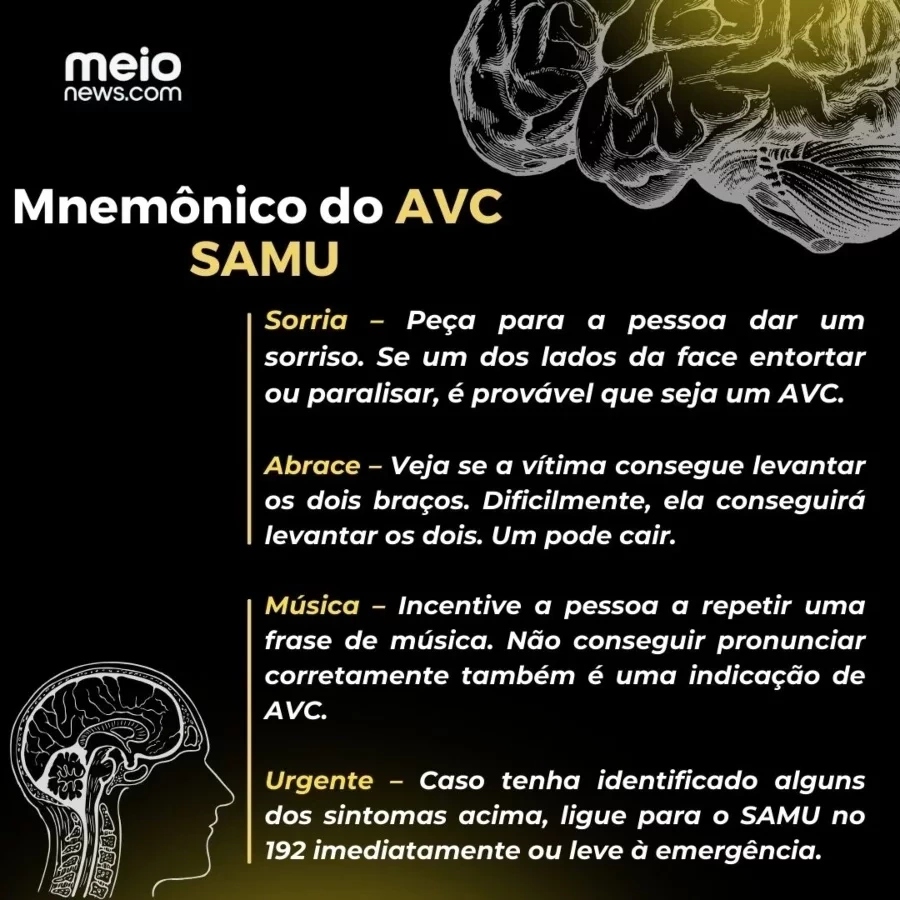 #PARATODOSVEREM A imagem é um cartaz informativo com fundo preto e detalhes em amarelo e branco, produzido pelo portal meionews.com. O tema central é a identificação rápida de um AVC (Acidente Vascular Cerebral), com o título: “Mnemônico do AVC SAMU”. No canto superior esquerdo está o logotipo do portal, “meionews.com”, em letras brancas. À direita, há uma ilustração de um cérebro humano, com linhas finas brancas e uma área amarelada destacando uma parte do órgão, simbolizando a região afetada durante um AVC. O texto do cartaz explica o significado de cada letra da sigla SAMU, como uma forma fácil de lembrar os sinais do AVC: S – Sorria: peça para a pessoa dar um sorriso; se um dos lados da face entortar ou paralisar, pode ser um AVC. A – Abrace: veja se a vítima consegue levantar os dois braços; geralmente, um dos braços não se levanta ou cai. M – Música: incentive a pessoa a repetir uma frase de música; se ela não conseguir pronunciar corretamente, é outro sinal.Urgente: caso algum sintoma seja identificado, deve-se ligar imediatamente para o SAMU, no número 192, ou levar a pessoa à emergência. Na parte inferior esquerda, há uma segunda ilustração de perfil da cabeça humana, com o cérebro desenhado em linhas brancas. FIM DA DESCRIÇÃO.