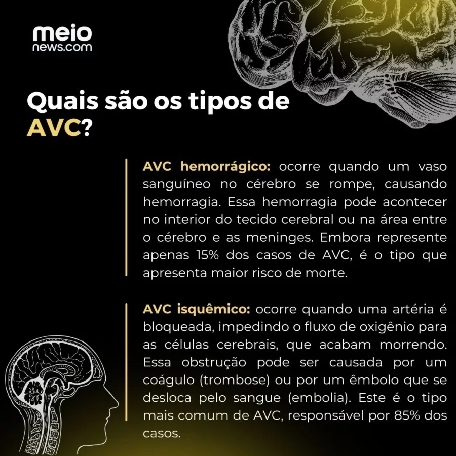 #PARATODOSVEREM A imagem é um cartaz informativo com fundo preto e detalhes em amarelo e branco, produzido pelo portal meionews.com, cujo logotipo aparece no canto superior esquerdo. O tema é “Quais são os tipos de AVC?”, com destaque visual para a sigla “AVC”, escrita em amarelo. No canto superior direito, há uma ilustração de um cérebro humano desenhado em traços finos brancos, com uma área amarelada na parte superior, simbolizando uma região afetada. No canto inferior esquerdo, outra ilustração mostra o perfil da cabeça humana, evidenciando o cérebro e o sistema circulatório cerebral, também em linhas brancas. O texto explica os dois principais tipos de Acidente Vascular Cerebral (AVC): AVC hemorrágico: ocorre quando um vaso sanguíneo se rompe no cérebro, provocando hemorragia. O texto informa que o sangramento pode acontecer dentro do tecido cerebral ou entre o cérebro e as meninges. Apesar de representar apenas 15% dos casos, é o tipo com maior risco de morte. AVC isquêmico: acontece quando uma artéria é bloqueada, impedindo o fluxo de oxigênio para as células cerebrais, que acabam morrendo. A obstrução pode ser causada por um coágulo (trombose) ou por um êmbolo deslocado pelo sangue (embolia). Este é o tipo mais comum, responsável por 85% dos casos de AVC. FIM DA DESCRIÇÃO.