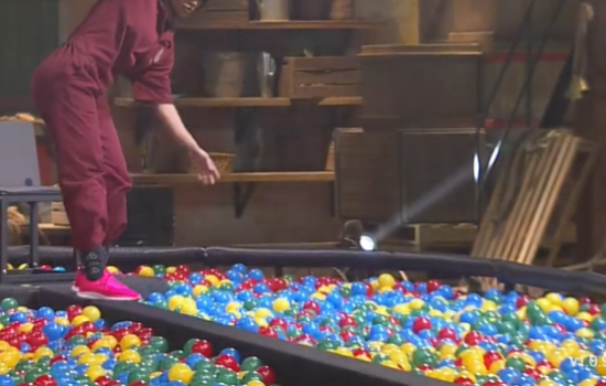 Aline, Bil e Mileide precisam girar várias vezes em uma cadeira, atravessar uma ponte de uma piscina de bolinhas, e por fim, encaixar as caixas conforme o gabarito.