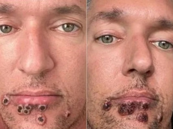 Morador da cidade Houston, no Texas, Steele relata que sentiu os primeiros sintomas por volta do dia 11 de julho, quando pequenas manchas brancas parecidas com espinhas começaram a aparecer ao redor da boca dele. “Achei que fossem queimaduras de navalha”, afirmou em seu perfil pessoal.