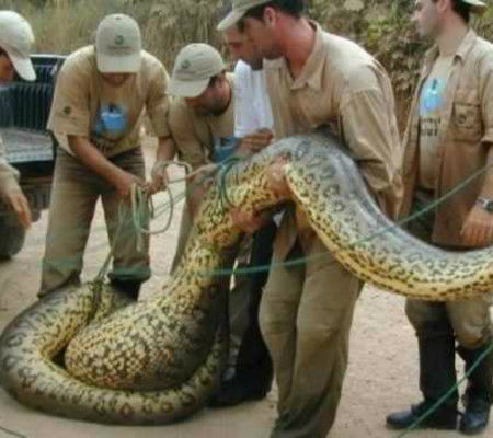 Pela posição dos olhos e das manchas laterais, a serpente pode ser uma anaconda, uma cobra semi-aquática que é comumente encontrada nos rios da América do Sul. Animal não venenoso geralmente atinge um tamanho substancial de cerca de 5-6 metros, e as fêmeas podem atingir até 8 metros.