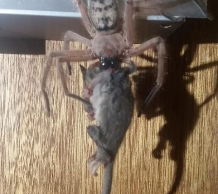 Na foto, a Huntsman se pendura a cabeça de uma dobradiça de porta e agarra a sua presa pelo pescoço. O marsupial morto – que parece ser um gambá pigmeu.