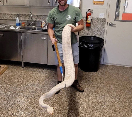 A foto de uma das maiores cascavéis do mundo começou a fazer sucesso nas redes sociais. A cobra albina pesa cerca de 9 quilos e mede 2,13 metros de comprimento.