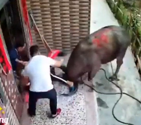 A mãe e seu bebê escaparam por pouco da morte, na China, quando um búfalo correu para eles depois de fugir de seus donos no caminho para o matadouro, informou em 23 de abril o jornal The Irish Sun.