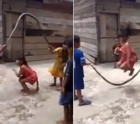 Segundo o jornal Daily Mail, o vídeo filmado no Vietnã mostra os pequenos rindo cantando enquanto pulam corda com uma enorme cobra morta.