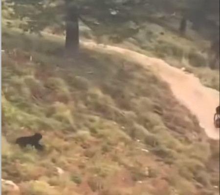 O atleta percorria a prova tranquilamente, mas de repente, um urso desceu a montanha na tentativa de atacar o rapaz. Nas imagens, o ciclista pedala cada vez mais rapido.