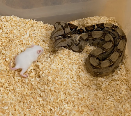 Uma jibóia de duas cabeças que está em cativeiro na Alemanha por um especialista em répteis, devorou dois ratos em um laboratório em poucos instantes. As cobras dão o bote para se alimentar e o momento foi registrado em vídeo. (assista a partir de 1:54).